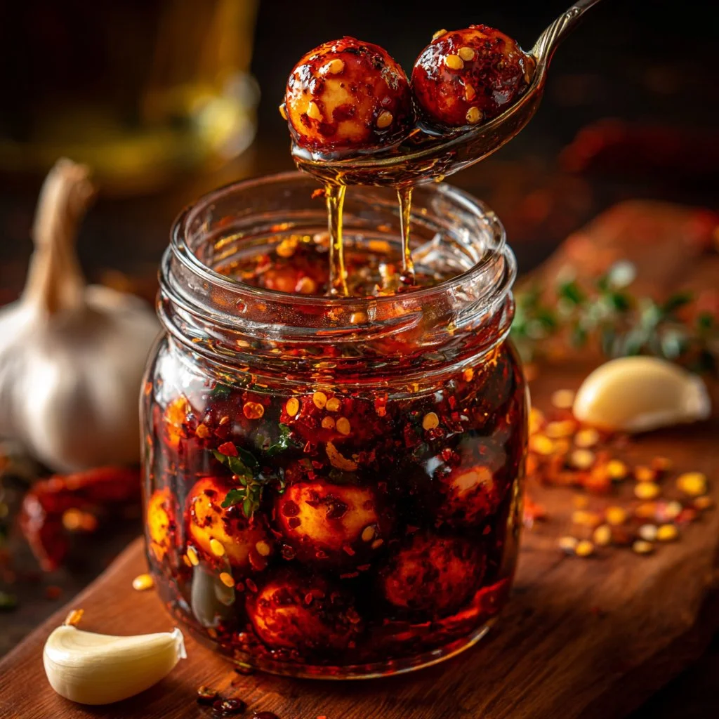 5. Place the mozzarella balls in a clean jar or bowl; pour the warm chili oil over them to coat.