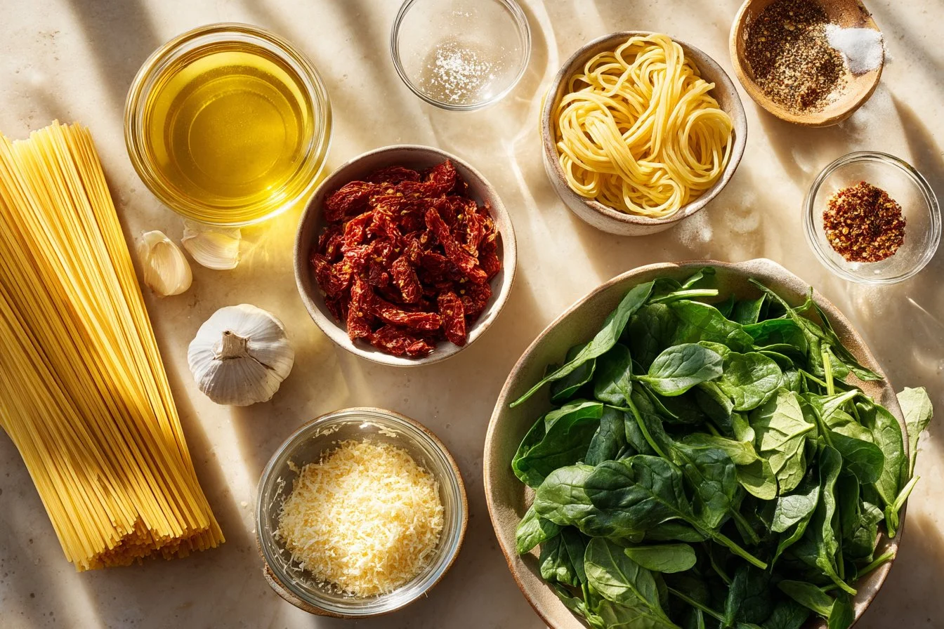 The kitchen fills with garlic and warm cream, and I always slow down to breathe it in. Right away, that aroma tells me dinner will be simple and good — this Spaghetti with Spinach and Sun-Dried Tomato Cream Sauce is one of those dishes. This always takes me back to Sunday dinners. Also, if you like bold, saucy pastas, you might enjoy my take on creamy Cajun beef spaghetti for a spicier night.