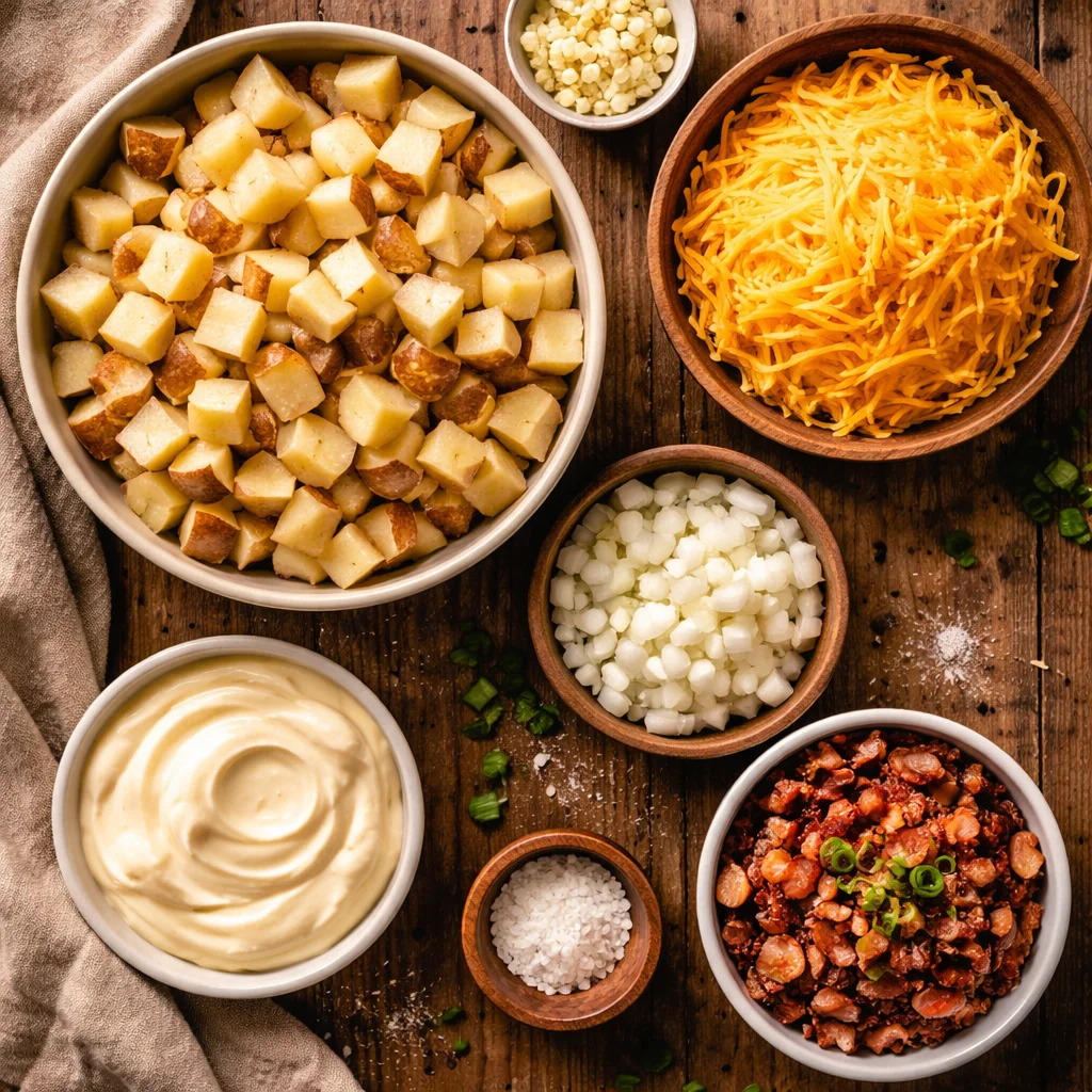 A cozy and cheesy casserole featuring diced potatoes, crispy bacon, and cheddar cheese, perfect for potlucks and family dinners.